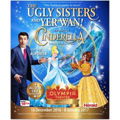 Al Porter and Dustin the Turkey put on a great performance of Cinderella in the Olympia Theatre, Dublin over Christmas. The Ugly sisters were very funny and Buttons, Polly’s friend(Ryan Andrews from Fair City) is sitting on Linda the Ostrich, who just happens to have a very deep voice. Al created a few funny scenes by smashing a whole ice-cream into Buttons face, which made the audience laugh out loud. Of course we all know the story of Prince Charming falling in love with Cinderella who tries to woo her. However Cinders is housebound by her step sisters whom she has to shave their backs, cut their nails and paint their dirty toenails as well as all the chores. She does not get a chance to go to the ball as she is put under lock and key. The fairy godmother (played by Al) comes to her rescue and turns her into a princess with a beautiful dress and horse and carriage. A lot of jokes were said about Al being a bit of a fairy. A Shetland pony walks across the stage to the delight of the audience. Just before the interval the actors engage with the audience by asking general questions about their lifestyle. One funny scene was of the Rocky Horror Picture show as the UGLY sisters lay in their beds after a night on the tiles at the ball with a Spice Box between them.